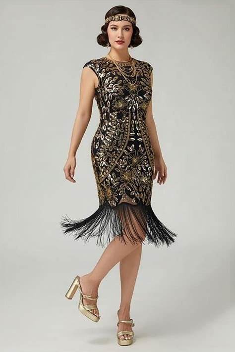 BABEYOND Women's Flapper Dress 1920S V-Neck Evening Gown Sequin Beaded Maxi Dress For Wedding Black Gold