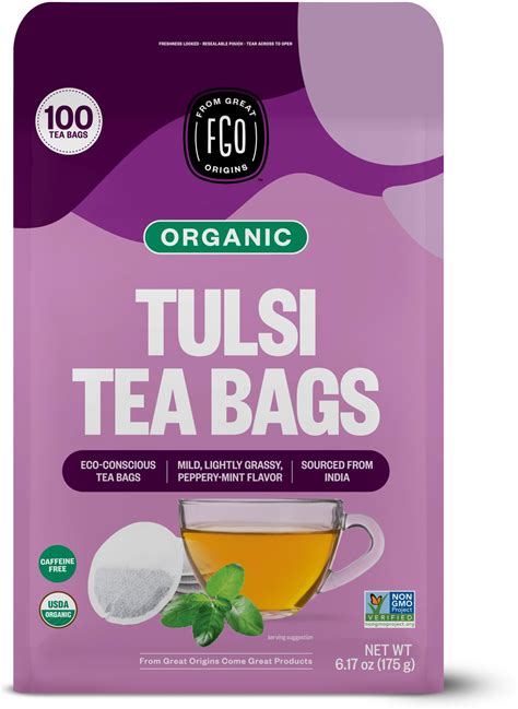 FGO Organic Tulsi Holy Basil Tea, 100 Count, Eco-Conscious Herbal Tea Bags, Resealable Bag, Caffeine Free, Packaging May Vary (Pack Of 1)